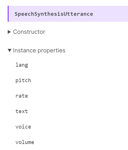 그 외에도 lang, text, voice, volume에 대한 값을 설정할 수 있다.