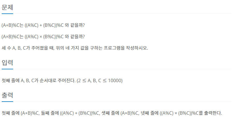 // 첫째 줄에 (A+B)%C, 둘째 줄에 ((A%C) + (B%C))%C, 셋째 줄에 (A×B)%C,
