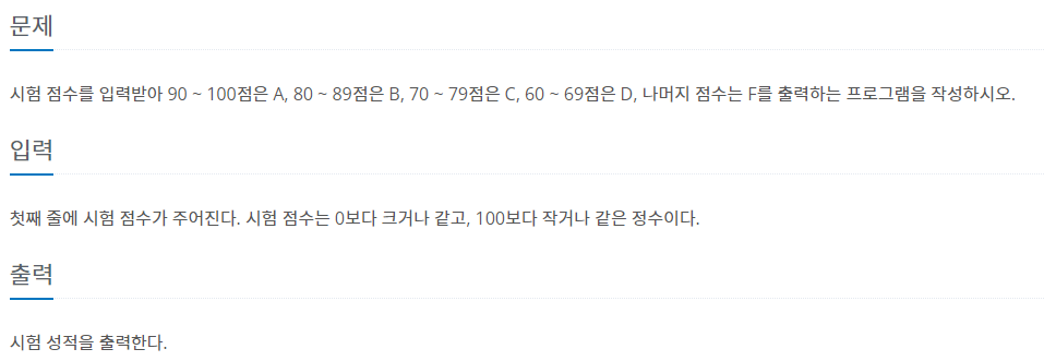 시험 점수를 입력받아 90 ~ 100점은 A, 80 ~ 89점은 B, 70 ~ 79점은 C, 60 ~ 69점은 D, 나머지 점수는 F를 출력하는 프로그램을 작성하시오.